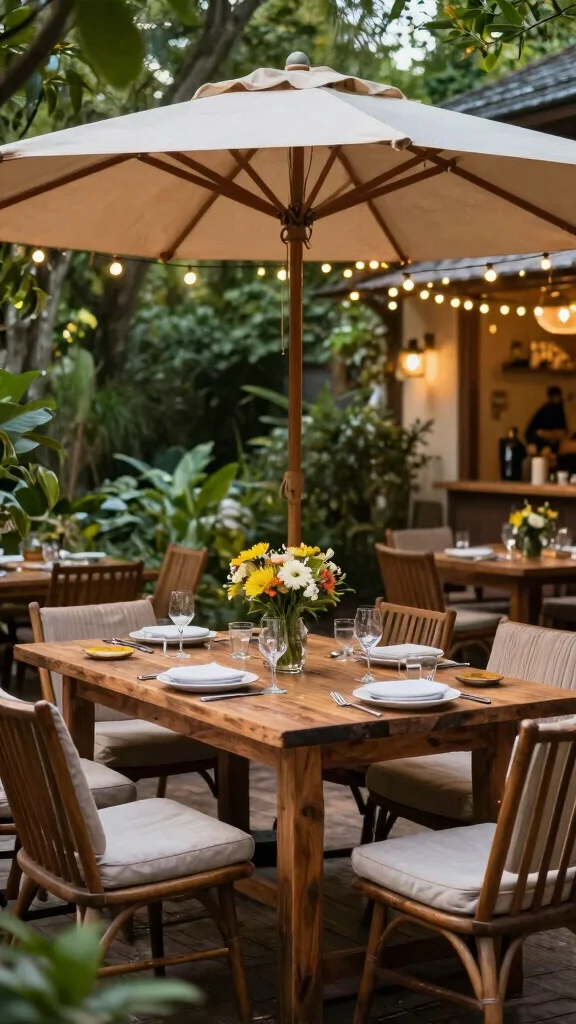 To bring this dining space to life, string lights overhead can create a magical ambiance for evening meals. A small outdoor kitchen or grill can make cooking outdoors more convenient and enjoyable for everyone. Adding potted herbs on the table not only enhances your meals but also adds a decorative touch.