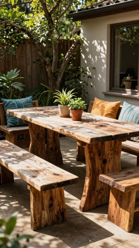 – Pair reclaimed wood tables with comfortable seating for gatherings.