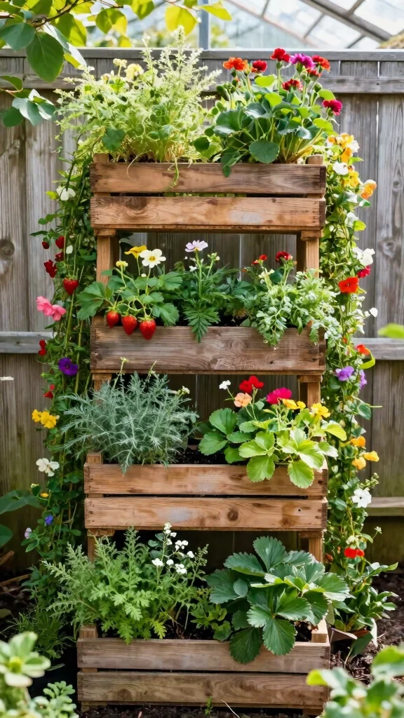You can create your vertical garden using stacked wooden crates or repurposed pallets. Itโs an ideal setup for herbs, strawberries, and other small crops that flourish in vertical arrangements, turning your gardening dreams into reality.