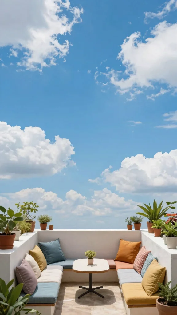 A painted sky ceiling adds a whimsical element to your balcony that transforms it into a dreamy retreat. Imagine beautiful blue shades interspersed with fluffy cloud patterns, creating a sense of openness and tranquility. This playful design invites creativity and can make even the coziest of balconies feel expansive.