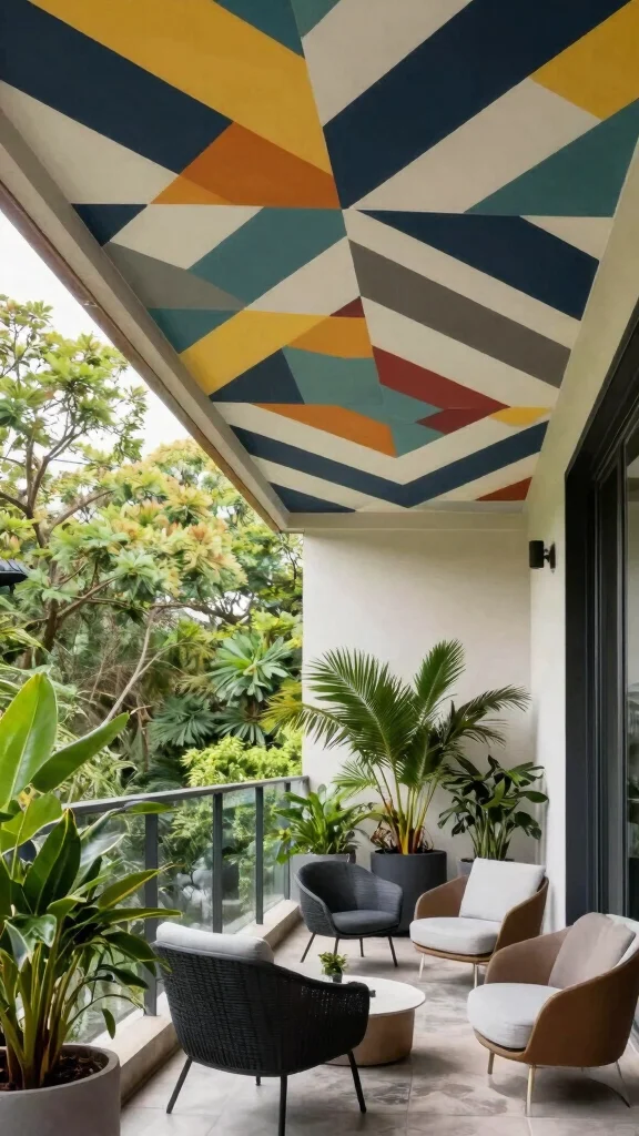 Incorporating geometric patterns into your balcony ceiling can add a striking modern flair. Using panels or paint, you can create eye-catching designs that draw attention upward, transforming the space into a focal point of creativity and style. This contemporary touch can evoke a sense of depth and excitement in your outdoor area.