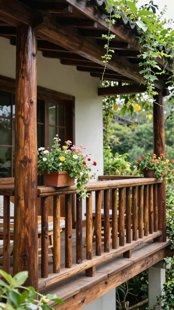 Wooden railings bring a natural warmth and rustic charm to your balcony, making it a cozy retreat.