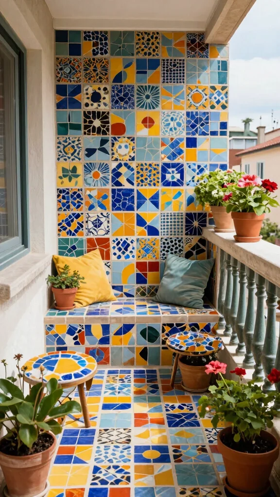 Colorful mosaic tiles can infuse your balcony with a joyful and playful spirit, allowing for endless creativity in your design. These vibrant tiles let you mix and match colors and patterns, creating unique designs that showcase your personality. Use them to outline seating areas or to form whimsical motifs that capture attention. Mosaic tiles pair beautifully with other materials like wood or concrete, creating an exciting contrast that enhances the vibrancy of your space.