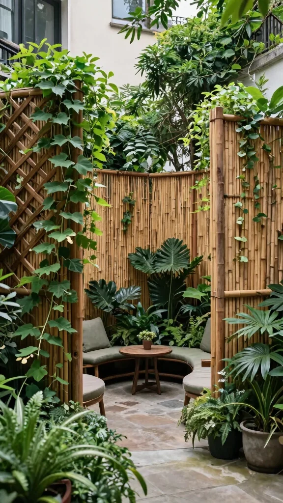Privacy screens turn a small courtyard into a private retreat. Build a cozy nook with trellises, bamboo, or tall potted plants, and train climbing vines for a lush, secluded vibe—perfect in your courtyard garden ideas for an intimate outdoor retreat.
