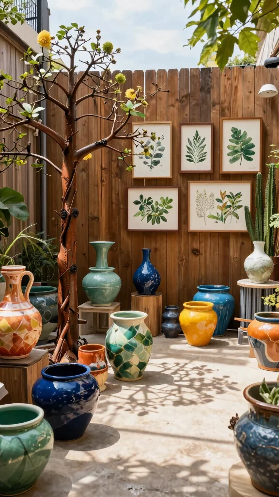 Support local artists by using their sculptures as focal points, or hang metal and wooden art pieces on walls or fences. Creating a gallery wall with framed botanical prints in weather-resistant frames adds a touch of elegance to the space.
