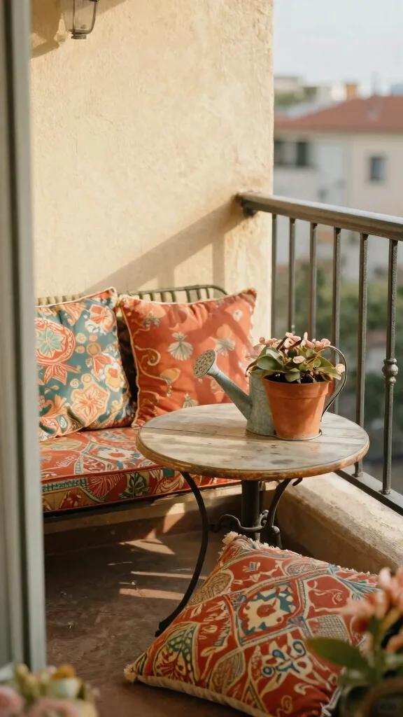 Add texture with weatherproof cushions, a rug, and a soft throw. Use plants as color pops to keep the balcony lively and inviting.