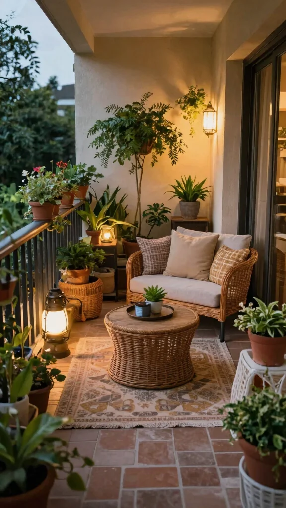 Don’t forget weatherproof plants that thrive in your light conditions (apartment balcony plants), and keep clutter away with smart storage like slim cabinets or hanging organizers.