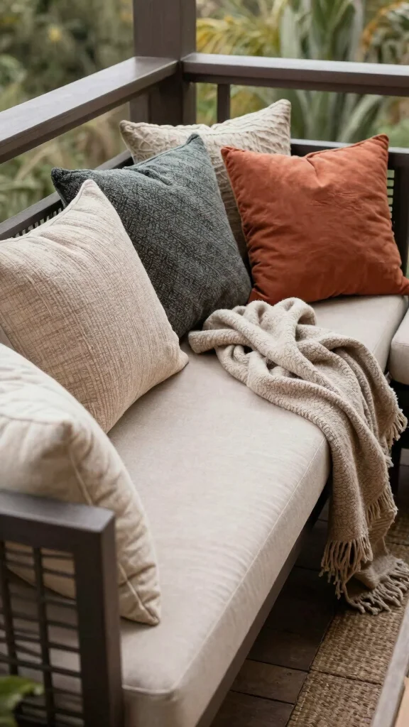 Soft textiles are essential for adding warmth and texture to your balcony. By incorporating various fabrics, you can transform hard surfaces into inviting spaces. Think about using throw blankets, decorative pillows, and plush rugs to create a cozy retreat.