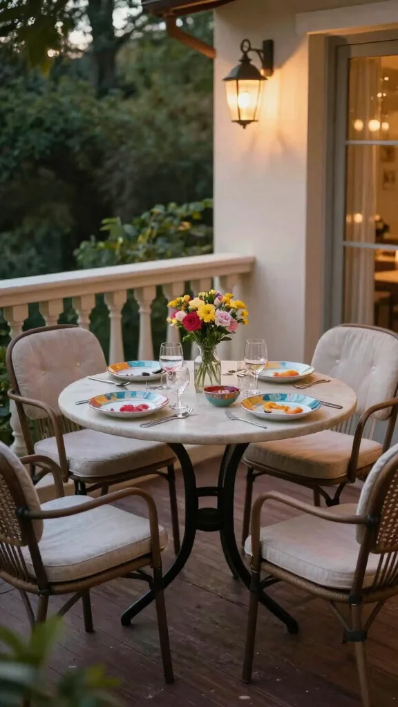 For tight spaces, consider using an extendable table that accommodates more guests when needed. A table with a built-in umbrella provides shade during the day, while decorative placemats, candles, or fresh flowers can enhance the dining atmosphere.