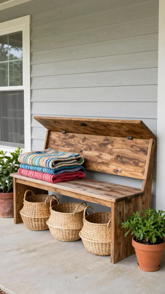 Fun fact: Smart storage is one of the easiest cozy front porch ideas. A porch with built-in benches and baskets keeps blankets, toys, and essentials within reach, so your guests and you enjoy a tidy, welcoming entrance without sacrificing style.