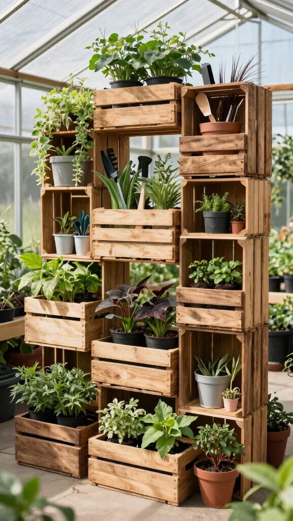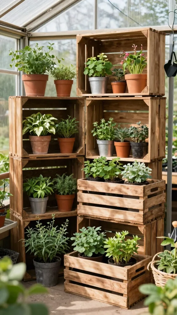 Rustic crate shelving creates a cozy atmosphere in your greenhouse, making organization enjoyable and stylish.