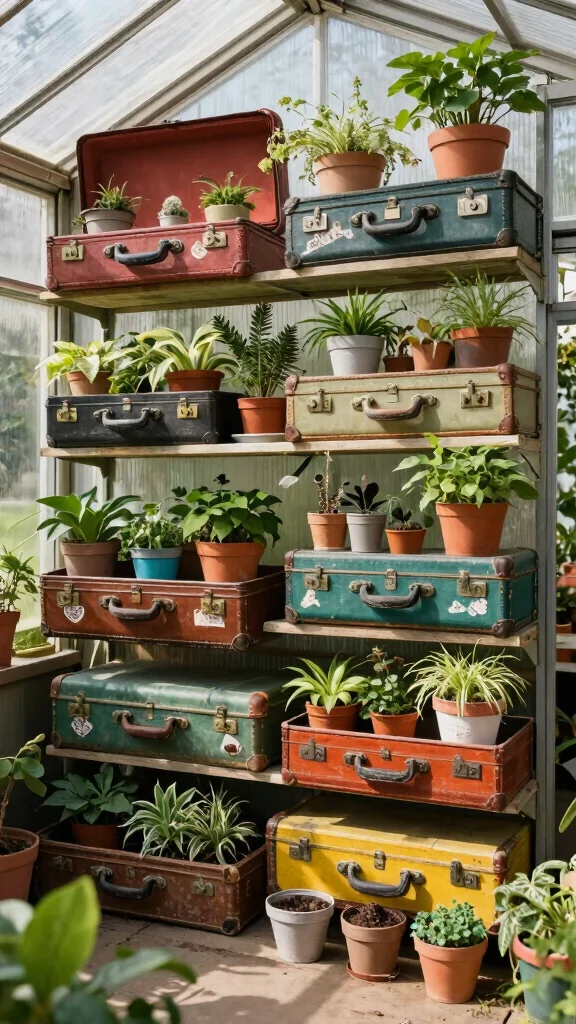 Using recycled suitcase shelves not only offers functionality but also creates a focal point in your greenhouse, showcasing your love for unique design.