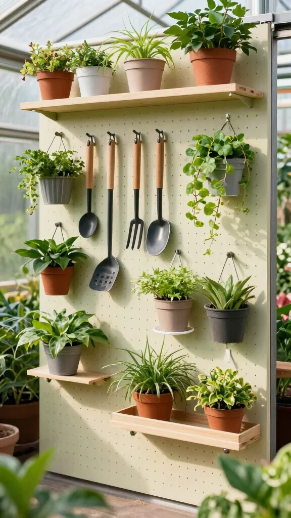 Pegboards are incredibly versatile for organizing your greenhouse. By adding hooks and shelves to a pegboard, you can create a customized storage solution tailored to your needs. This setup is perfect for tools, pots, and hanging plants, helping you keep everything organized and accessible.
