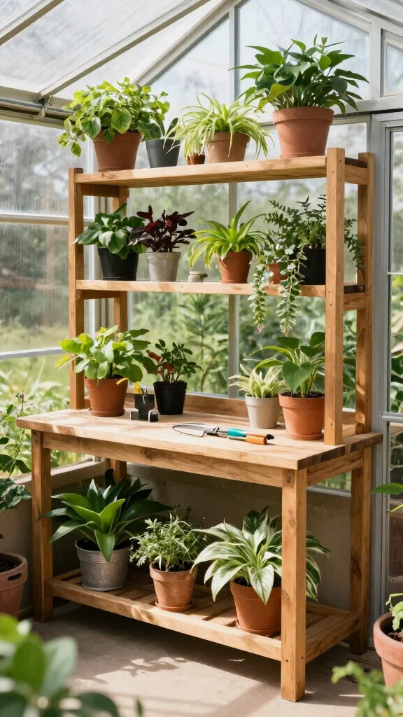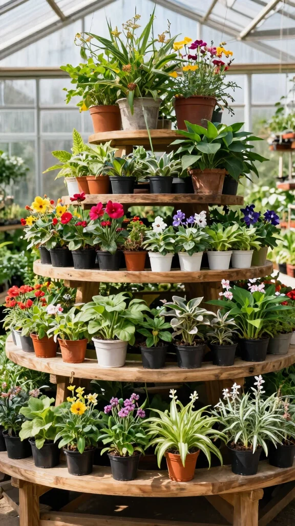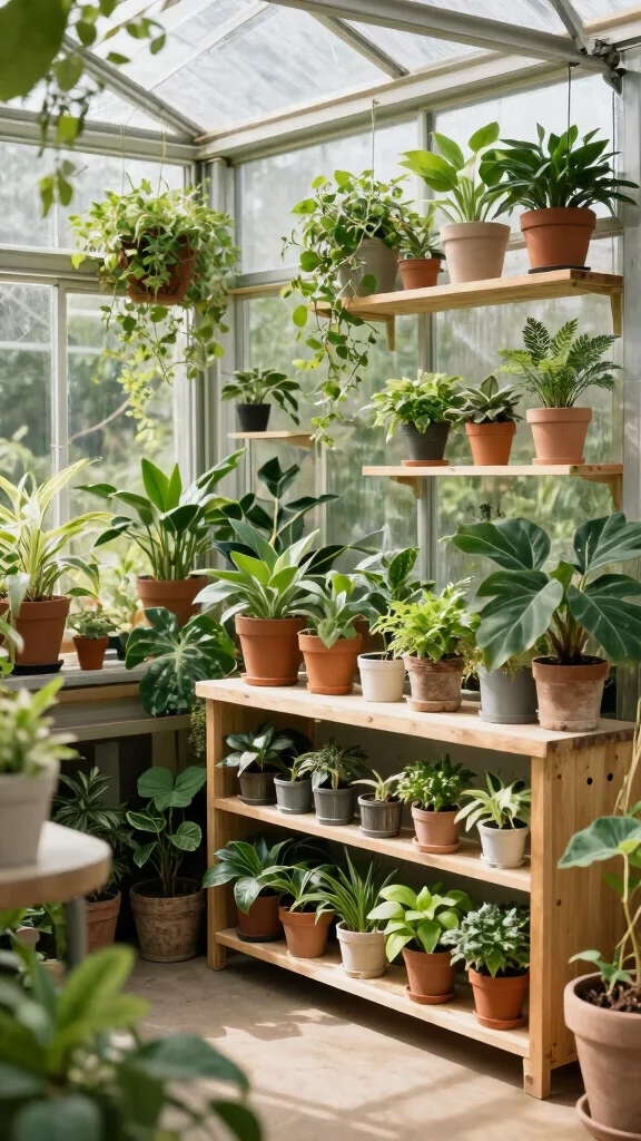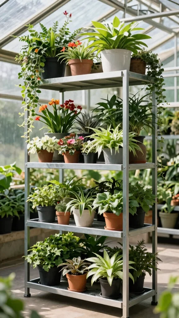 Tiered plant stands elevate your plant presentation, transforming your greenhouse into a lively showcase of greenery.