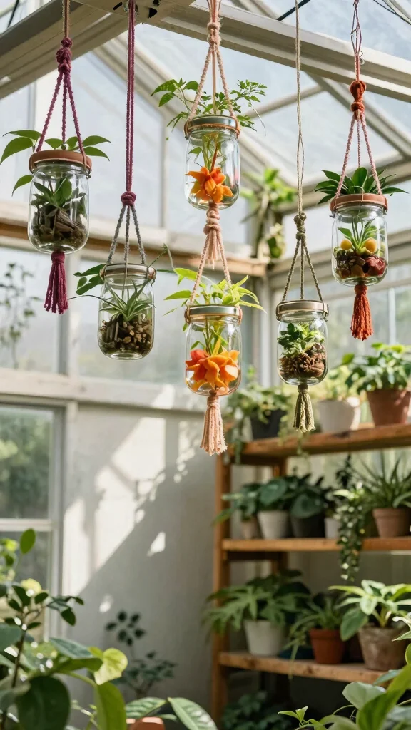 Hanging glass jar shelves not only keep your plants organized but also create a stunning visual display that enhances the charm of your greenhouse.