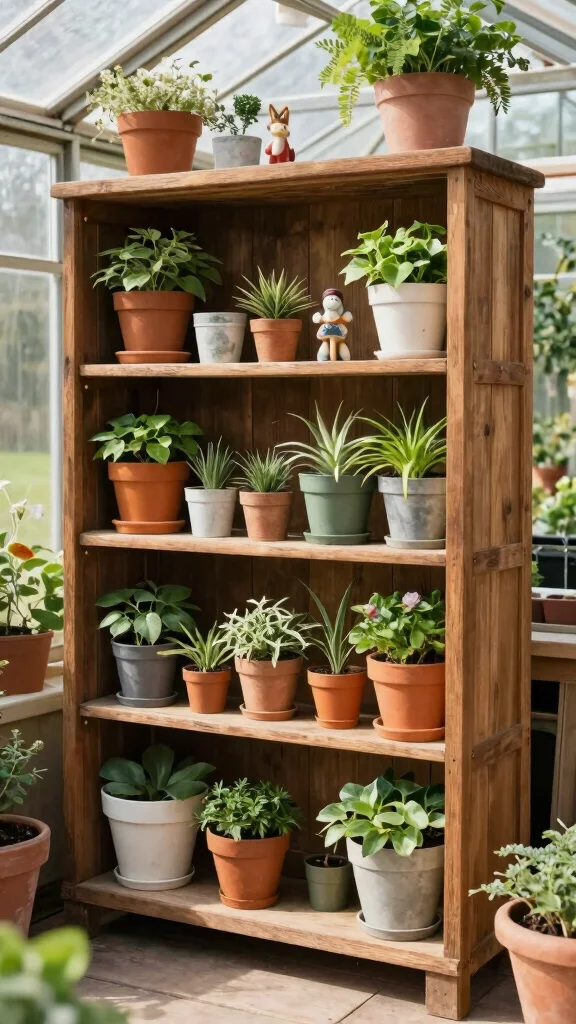 Repurposed bookshelves not only organize your greenhouse but also introduce a unique charm that enhances the overall aesthetic.