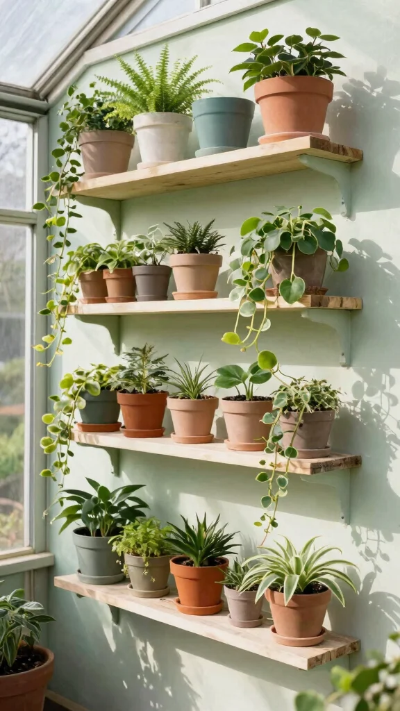 Wall-mounted shelves are an effective way to utilize vertical space in your greenhouse. These shelves can be installed at any height, allowing for a customized plant display that suits your needs. Individual floating shelves or a series of brackets can hold multiple pots beautifully.