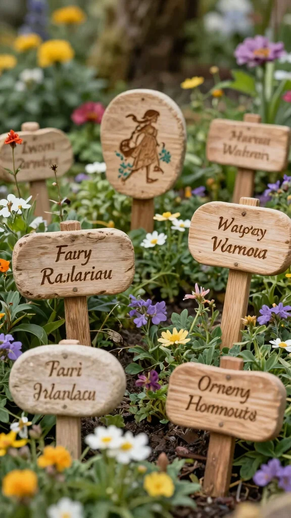 Personalized signs add a homey touch, making your garden feel like a true fairy sanctuary. This whimsical detail enhances the overall charm and invites storytelling in your enchanting space.