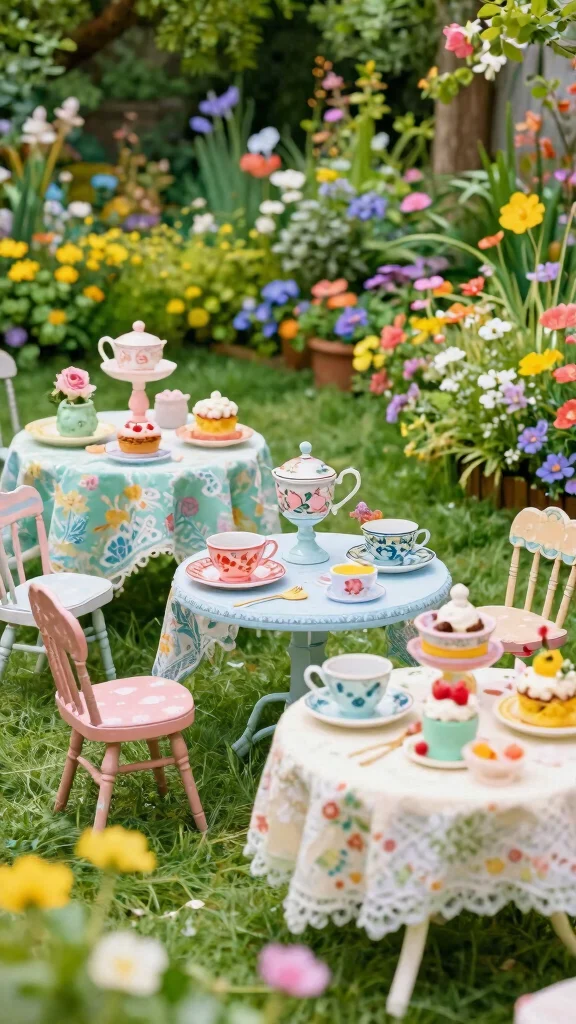 For your tea party setup, use small plates and cups from craft stores or create your own from recycled materials. Enhance the scene with faux desserts made from foam or clay, adding a playful touch. Playing soft music in the background can elevate the atmosphere, making it feel truly magical. This approach connects to trends of creating immersive outdoor experiences that engage the senses.
