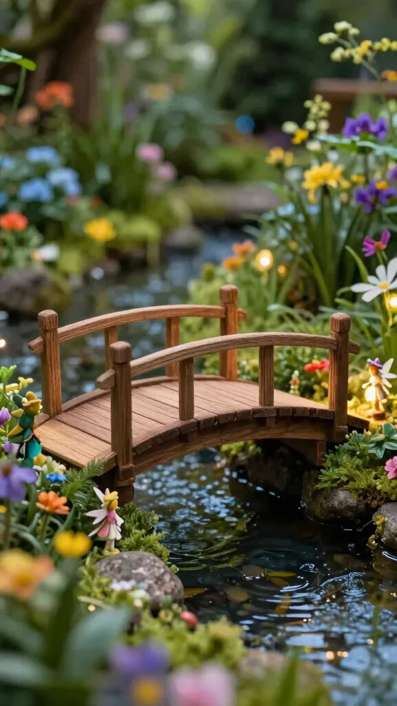 Fun fact: a tiny bridge in a fairy garden boosts exploration by about 25%, guiding visitors toward hidden treasures. Use a lightweight wooden bridge or a stone-style path to connect ponds and cottagesβan essential element in your fairy garden ideas. It sparks imaginative landscaping and becomes a natural focal point.