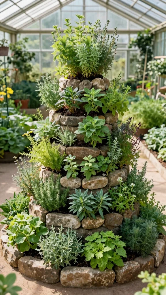 An herb spiral offers a unique and effective way to grow a variety of herbs within a compact space. This design features a spiraled raised bed that creates diverse microclimates, allowing for different herbs requiring varied light and moisture levels to flourish together. It’s both functional and serves as an eye-catching focal point in your greenhouse.