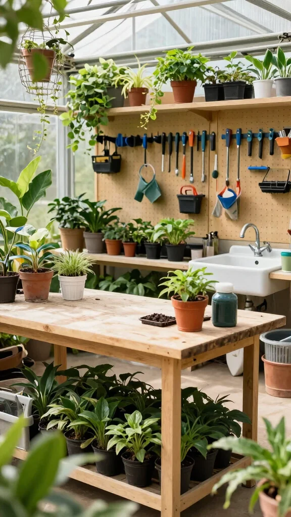 Organize tools with hooks or pegboards, ensuring good lighting for detail-oriented work. Adding a sink for easy cleanup post-planting elevates the functionality of your workspace.