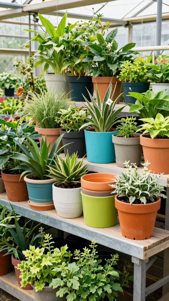 Select lightweight pots for easy movement and consider incorporating colorful containers to bring personality to your greenhouse. Remember to ensure proper drainage for healthy plants.