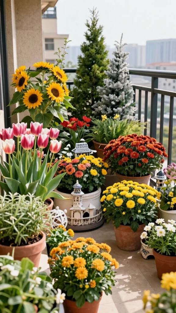 Keep your balcony garden fresh and exciting by creating seasonal displays. Change out your plants and decor as the seasons shift to maintain visual interest throughout the year. In spring, opt for cheerful blooms like tulips and daffodils; summer brings vibrant sunflowers and zinnias; fall can feature rich tones of chrysanthemums and ornamental peppers; while winter can showcase evergreen plants and festive decorations.