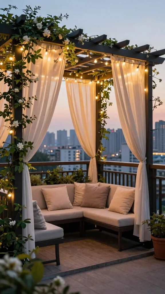 Add elegance to your balcony with a stylish pergola or canopy that provides shade while defining your outdoor space. This structure creates an inviting environment perfect for relaxation. Drape outdoor fabric or string fairy lights to enhance the ambiance, making the space feel magical. Incorporate climbing plants like wisteria or jasmine for a natural touch that softens the structure.