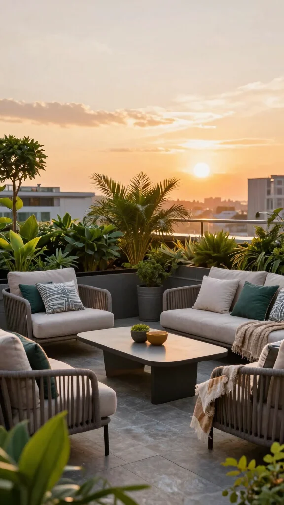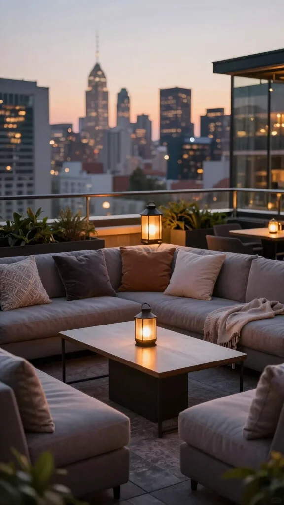 Creating a cozy outdoor lounge area can turn your rooftop into a serene retreat for relaxation and social gatherings. Envision plush weather-resistant sofas, cozy throws, and soft lighting that invite you to unwind under the stars. Incorporating chic garden furniture gives your space an inviting yet stylish vibe.