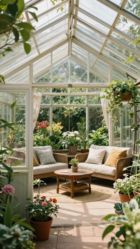 Create a serene outdoor atmosphere with a greenhouse that includes a living area. This design encourages you to enjoy your garden while being surrounded by greenery, making it an ideal retreat for relaxation. An outdoor living space integrated with your greenhouse can become your favorite spot for socializing or simply enjoying nature.