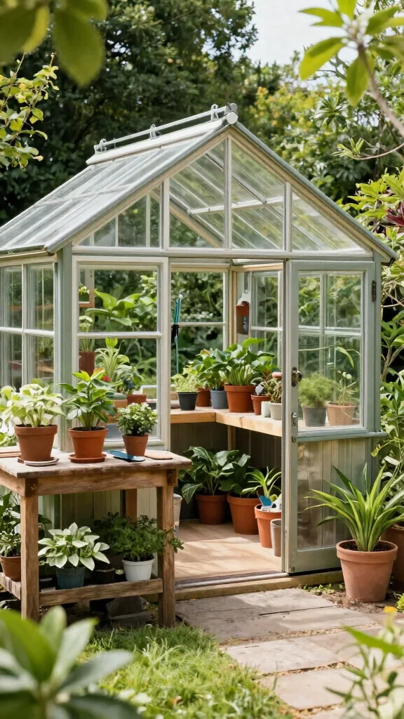 To design this space, incorporate workbenches and storage areas within the greenhouse. This setup keeps your gardening supplies organized and accessible.