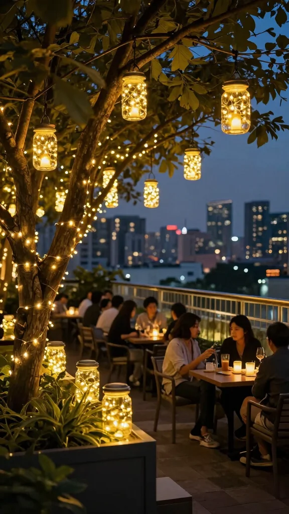 Repurpose glass jars into cozy firefly lanterns for your outdoor rooftop patio ideas. Use LED fairy lights to create twinkling ambiances that use less energy and more charm. Pro tip: string a few around railings for instant eco-friendly enchantment at sunset.