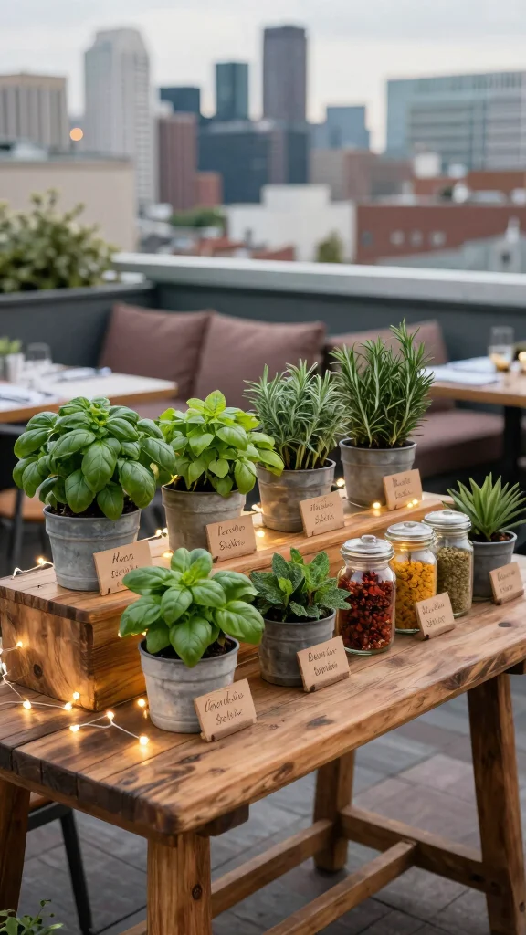 Elevate your outdoor dining experience by creating an herb and spice station on your rooftop patio. This interactive feature not only adds flavor to your meals but also encourages guests to customize their dishes, making dining more engaging. Consider using recycled or repurposed containers to house your herbs and spices, reinforcing your commitment to sustainability.