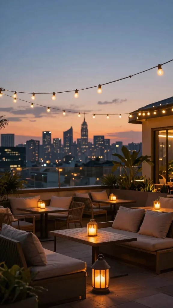 The right lighting creates a cozy retreat on your rooftop, inviting friends to linger longer as they enjoy your thoughtfully designed space.