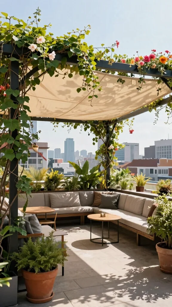 Did you know natural shade can reduce rooftop heat by up to 60%? Choose a canvas canopy or pergola with climbing vines to block harsh sun, creating a cooler, inviting space for relaxed entertaining and easy outdoor dining.