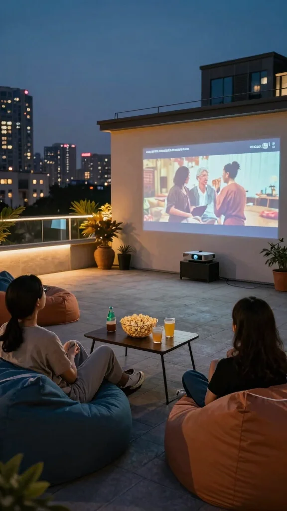 Turn your rooftop into a cinema paradise by hosting outdoor movie nights. Setting up a projector and a screen or using a blank wall creates an unforgettable experience for family and friends. Cozy seating, warm blankets, and delicious snacks make this a perfect way to enjoy your terrace while having fun under the stars.Select a quality projector and screen suitable for outdoor use, ensuring visibility and sound quality. Create comfortable seating with lounge chairs, bean bags, or floor cushions to enhance the experience. Include a small table for snacks like popcorn and drinks to keep everything within reach. Soft lighting can create ambiance without interfering with the movie.Here are some essentials for a great outdoor movie night: