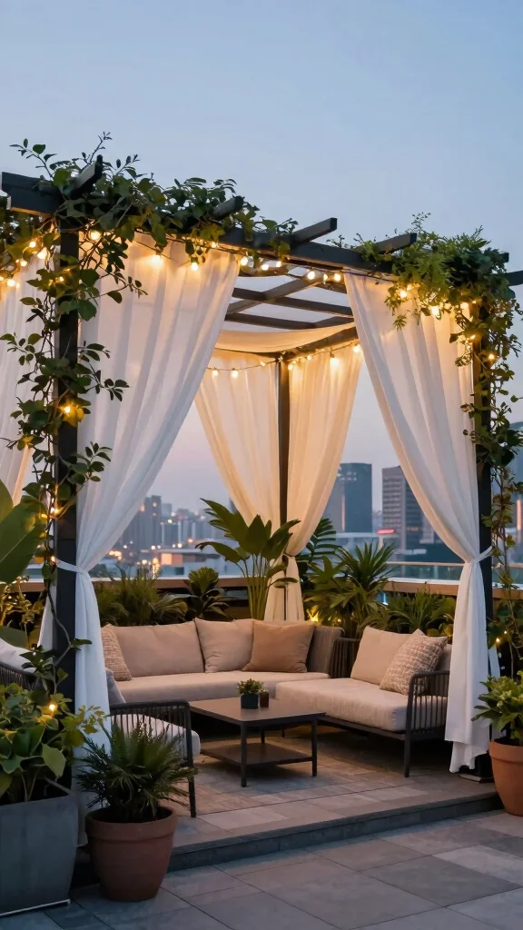 Elevate your rooftop design with a stylish pergola that provides shade and elegance. This structure creates a defined space for relaxation and can be draped with soft fabrics or adorned with climbing plants to enhance the atmosphere. Comfortable outdoor seating paired with a coffee table transforms it into the perfect lounge spot.When choosing a pergola, consider a design that complements your home’s architecture, whether modern or rustic. Drape fairy lights or fabric to create a warm ambiance, and add hanging planters for extra greenery. Incorporating outdoor heaters or a fire pit can extend the use of this space into cooler evenings.Enhance your pergola paradise with these ideas: