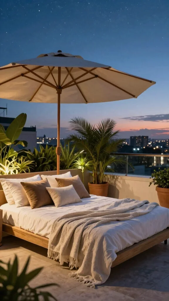 For those lazy afternoons, a luxurious lounge bed on your rooftop terrace provides the ultimate relaxation experience. These oversized cushions invite you to sink in, soak up the sun, or gaze at the stars at night. Adding a canopy or shade enhances comfort while offering a sense of privacy.When selecting lounge beds, choose weather-resistant fabrics and materials that withstand outdoor conditions. Position them near the best views for an ideal relaxation spot. Incorporate throw blankets and pillows to increase comfort, and consider using umbrellas or awnings to create shade during sunny days.Enhance your lounge bed area with these suggestions: