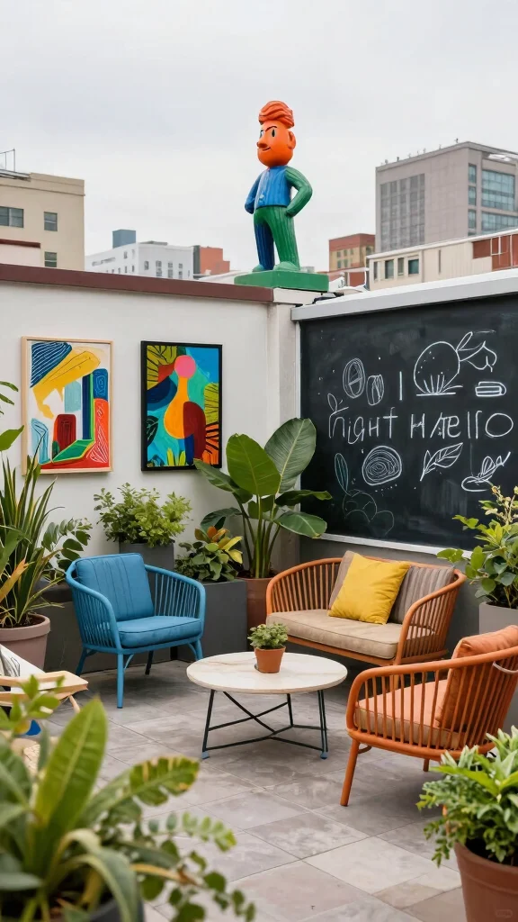 An art-inspired rooftop fosters creativity and personal expression, making it a one-of-a-kind outdoor paradise.