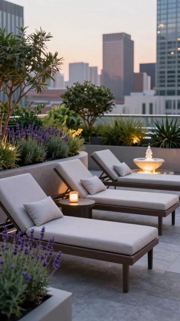 Fun fact: Roof garden rooftop terrace design ideas can support an outdoor spa escape, boosting urban livability—a couple of lounging zones and a gentle water feature transform space into a retreat. Lavender and soft lighting heighten calm and scent, making it a practical retreat right on your balcony.