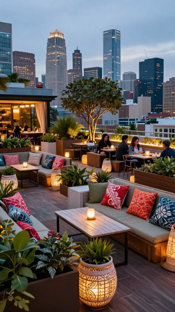 Design a luxurious lounge area that serves as an outdoor living room, inviting relaxation and socializing. Plush sofas, stylish coffee tables, and colorful cushions can transform your rooftop into a chic retreat. Adding an outdoor rug and ambient lighting, like string lights or lanterns, creates a warm atmosphere perfect for entertaining or unwinding with a book.