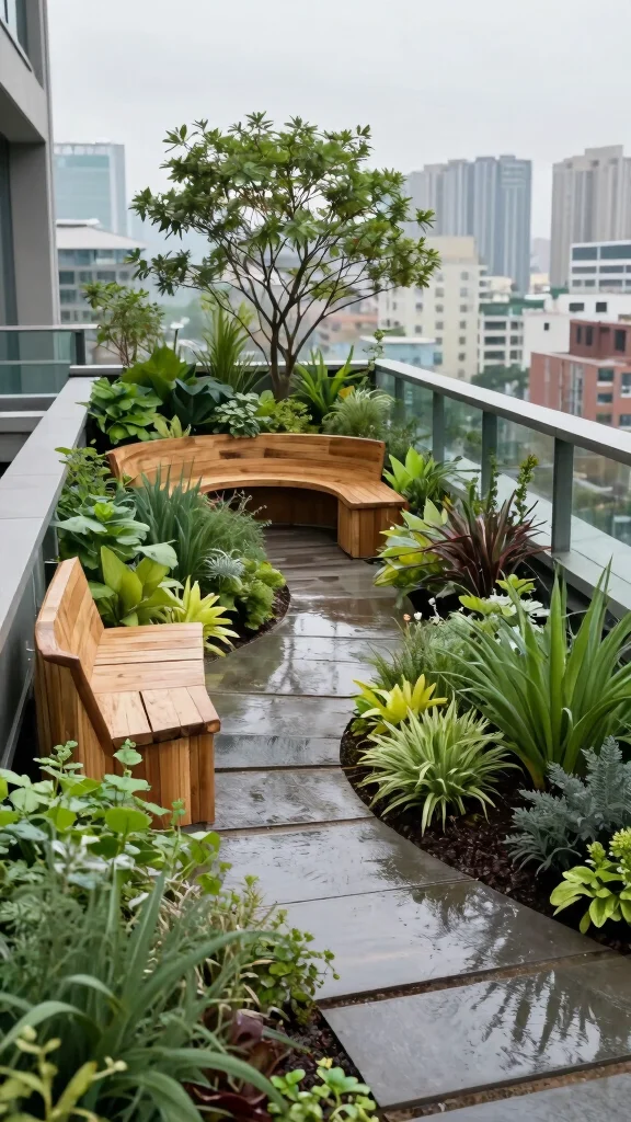 A rain garden on your rooftop is totally doable: plant native species that thrive in wet conditions and use natural materials for pathways. Turn excess stormwater into a lush, sustainable oasis—practical, stylish, and ready for your roof garden rooftop terrace design ideas.