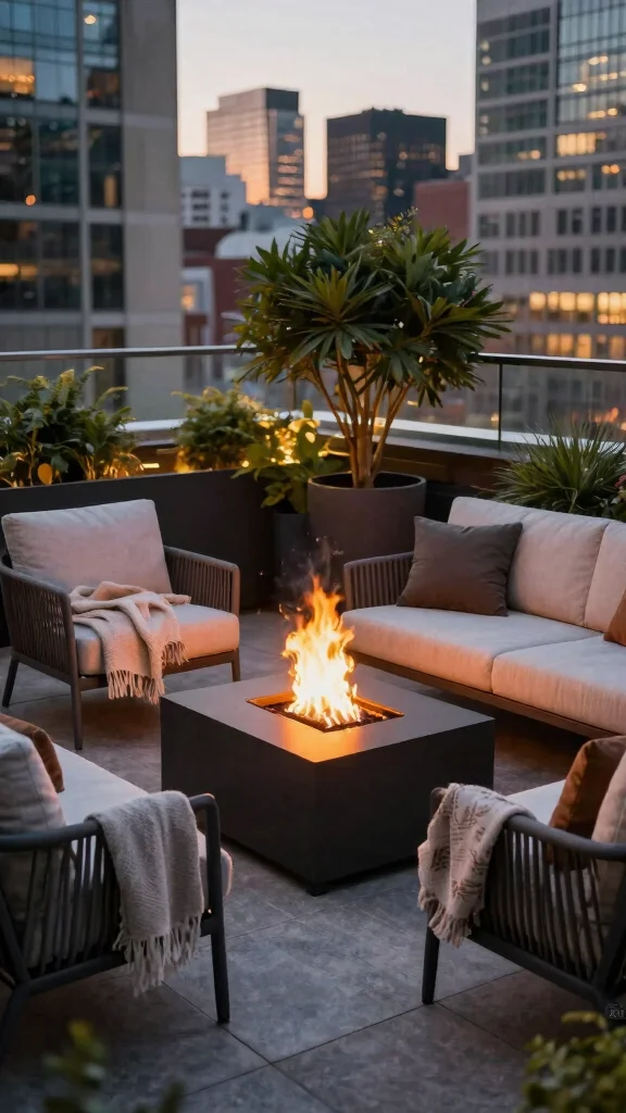 A rooftop fire pit paradise combines luxury and sustainability, creating a welcoming space for year-round enjoyment.