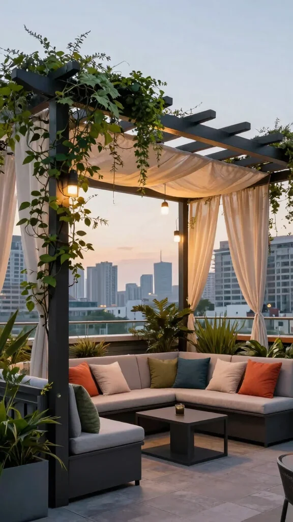 A modern pergola can provide shade while adding a stylish architectural element to your rooftop. Drape it with climbing plants or fabric to create a cozy nook perfect for relaxation. Complement the space with comfortable seating and a sound system for soothing music or ambient sounds.