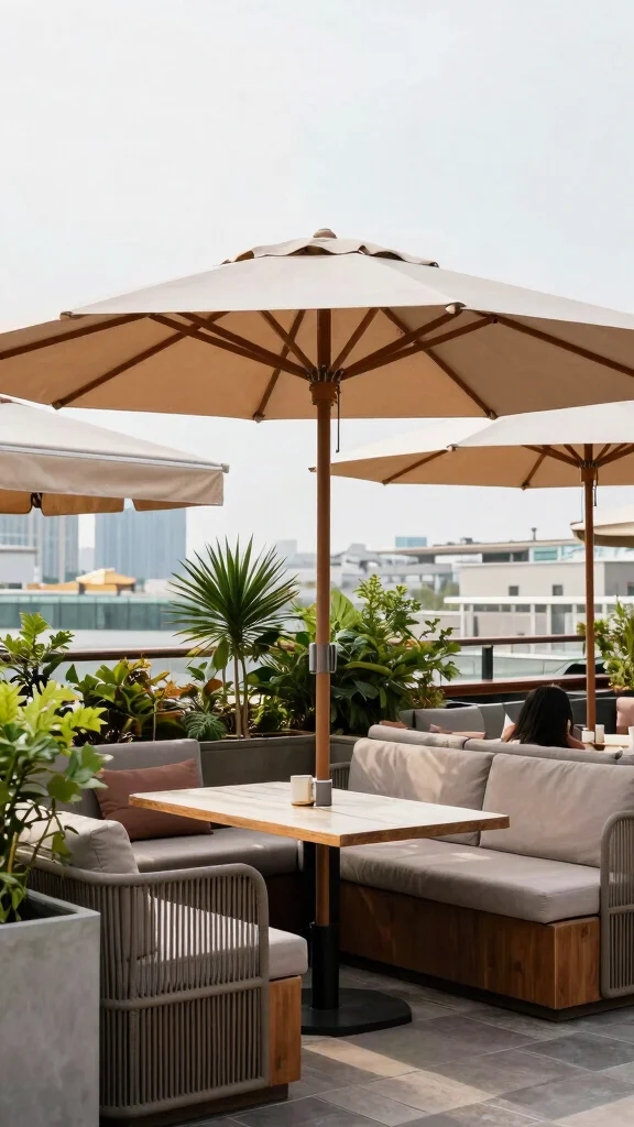 Chic shade solutions ensure your rooftop bar remains enjoyable, whether it’s a sunny afternoon or a light drizzle. Thoughtfully integrated, these elements can enhance the overall aesthetic charm of your outdoor space.