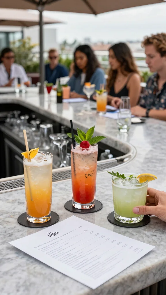For a dynamic menu, experiment with seasonal flavors to keep things exciting and fresh. Offer stylish non-alcoholic options that are just as flavorful, ensuring everyone feels included. Consider signature drinks that capture the spirit of your rooftop bar, adding a personal touch to the experience.