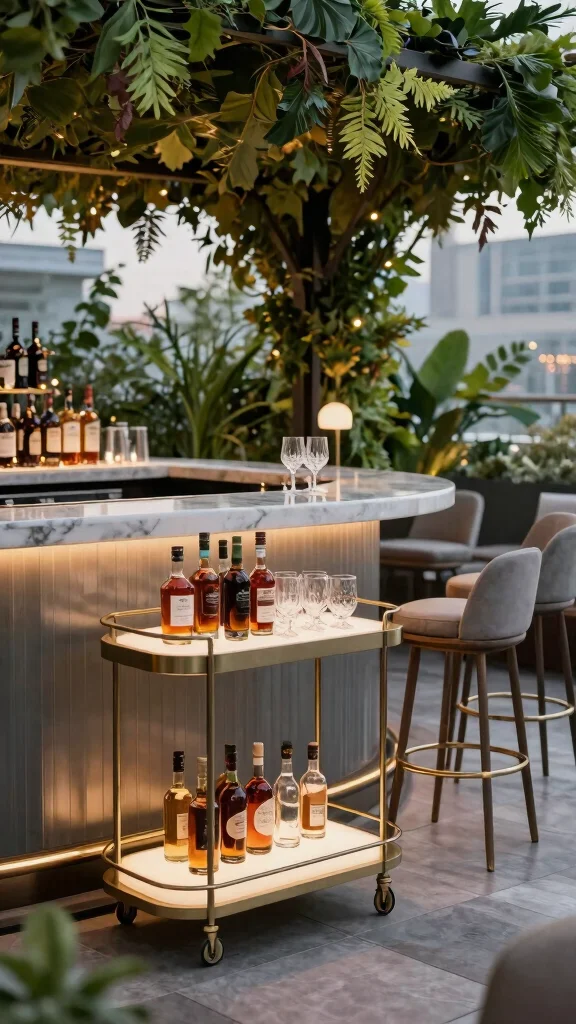 Add vertical greenery or slim planters to boost privacy and style without taking up precious floor space. Maximize impact with lighting: warm LED string lights, discreet wall sconces, and dimmable lanterns to create outdoor bar aesthetics after dark.