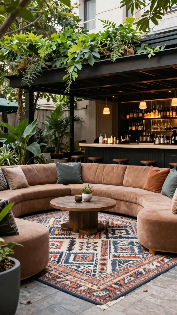 Consider a lightweight pergola or shade sail to sculpt a dedicated lounge zone while preserving an airy outdoor bar aesthetics.