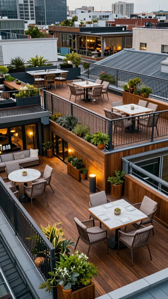 Install a mix of privacy screens, trellises, or tall potted plants that create a cocoon of space. Use outdoor curtains or a retractable shade to control sun and wind without blocking the view, aligning with luxury rooftop ideas and rooftop bar decor.
